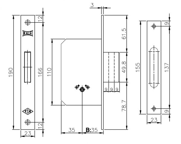 Замок врезной, крестообразный Kale-kilit 189 F (35 мм), 3 ключа, цвет золото.